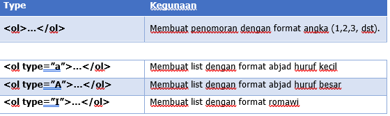 Ordered List pada halaman web dapat menggunakan tag <ol></ol> dengan mempunyai tipe list berikut ini.
