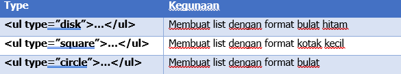 Unordered List pada halaman web dapat menggunakan tag <ul></ul> dengan mempunyai tipe list berikut ini.
